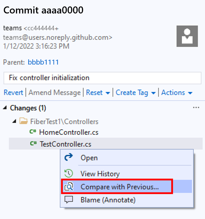 In het venster Doorvoeren kunt u met de rechtermuisknop op een bestand klikken en Vergelijken met Vorige selecteren om de bestandswijzigingen te bekijken die door de doorvoer zijn aangebracht.