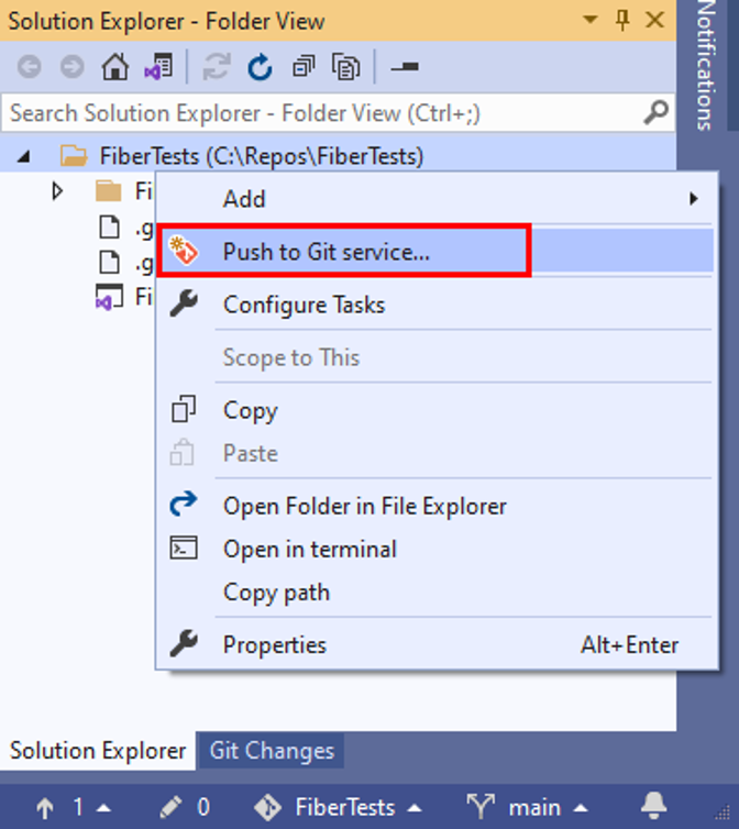Maak verbinding met een Azure DevOps-opslagplaats door met de rechtermuisknop op de naam van de oplossing in Solution Explorer te klikken en vervolgens Push naar de Git-service te selecteren om het venster Een Git-opslagplaats maken te starten.