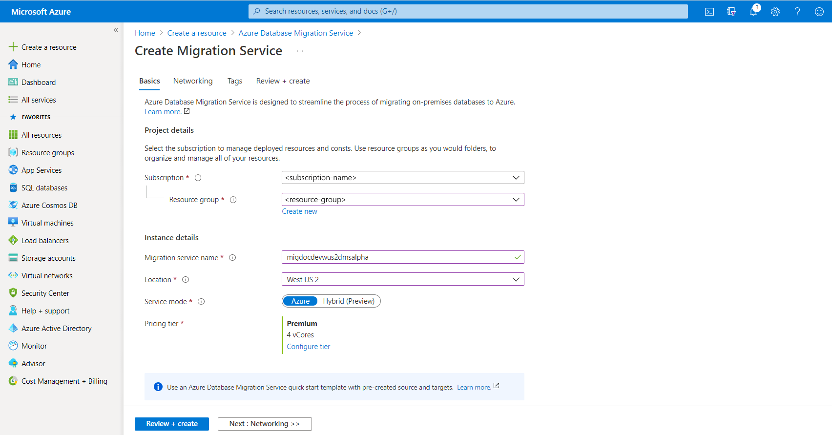 Geef in het scherm Migratieservice maken een naam op voor de service, het abonnement en een nieuwe of bestaande resourcegroep.