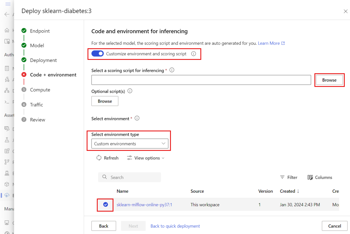 scoring_scriptenenvironmentwordt alleen ondersteund voor dePyFuncmodelvariant. Zie MLflow-modelimplementaties aanpassen als u een andere modelsmaak wilt gebruiken.De implementatie maken: