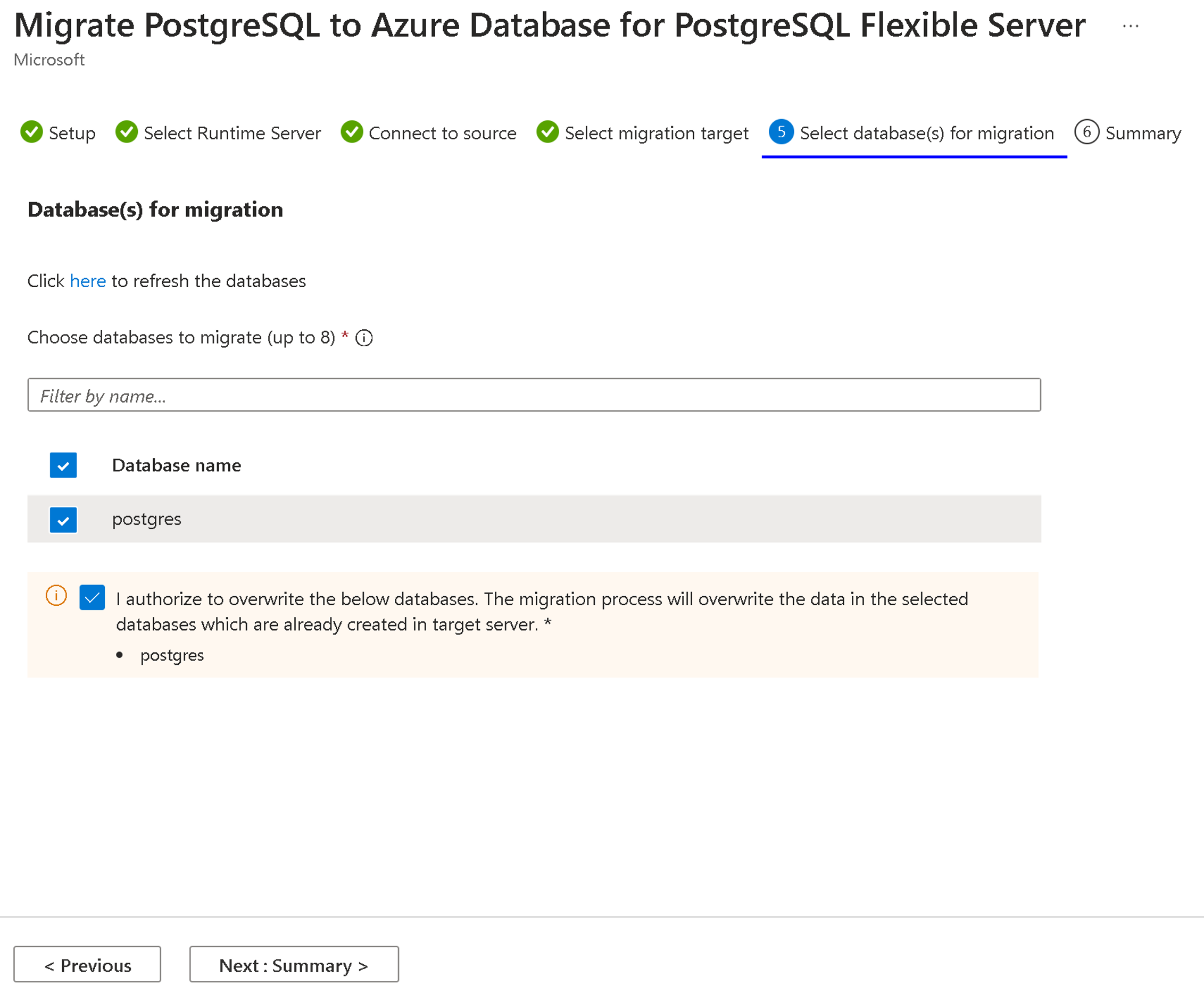 Nadat u de databases hebt geselecteerd, selecteert u Volgende: Samenvatting.