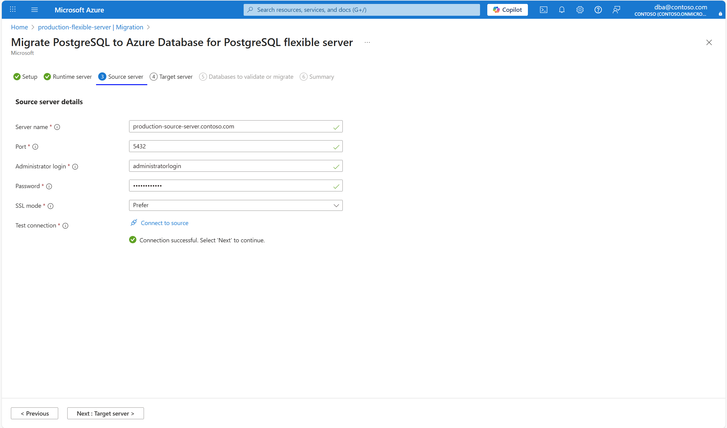 production-flexible-server.example.com,198.1.0.2of een PostgreSQL-FQDN, zoalsproduction-flexible-server.postgres.database.azure.com, als de aangepaste DNS-server de DNS-zonepostgres.database.azure.combevat of query's doorstuurt voor deze zone naar168.63.129.16, waar de FQDN wordt omgezet in de openbare of privé-DNS-zone van Azure. - Testverbinding : voert de connectiviteitstest tussen de bron en het doel uit. Zodra de verbinding tot stand is gebracht, kunt u doorgaan naar het volgende tabblad. Deze test is bedoeld om connectiviteitsproblemen te identificeren die mogelijk bestaan tussen de bron- en doelservers, inclusief verificatie met behulp van de opgegeven referenties. Het tot stand brengen van een testverbinding duurt enkele seconden.