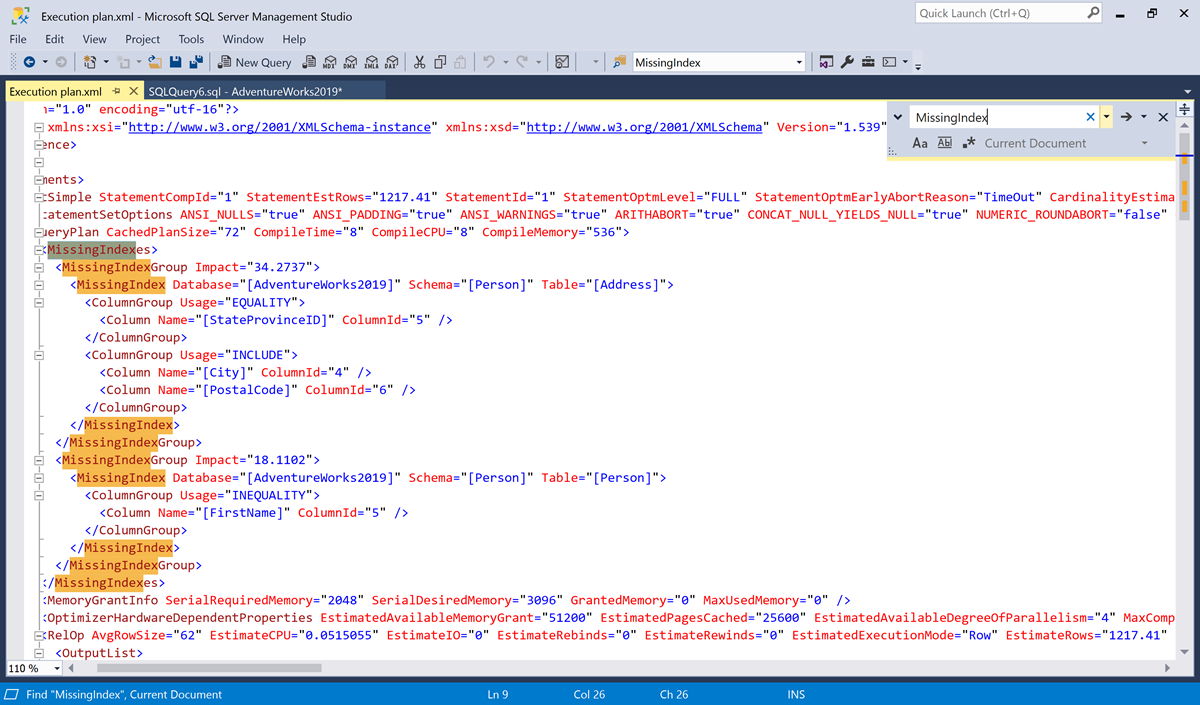 Person.Addresstabel die ondersteuning biedt voor gelijkheid zoeken in deStateProvinceIDkolom, die twee kolommen bevat enCityPostalCode'. Op het moment van optimalisatie geloofde de optimalisatie van de query dat deze index de geschatte kosten van de query met 34.2737%zou kunnen verlagen. - De tweede ontbrekende index suggereert dat de query een index kan gebruiken in de