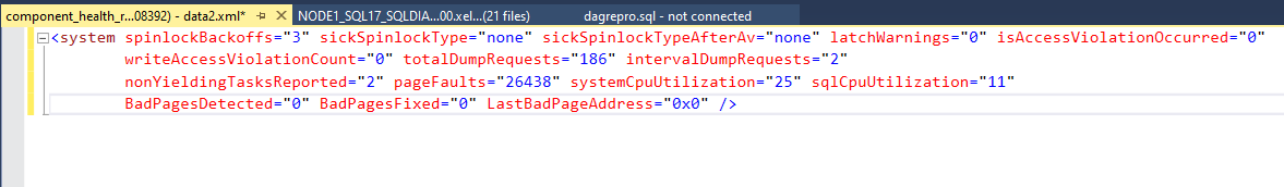 De gegevens 'totalDumprequests=186' geven aan dat er te veel diagnostische gebeurtenissen voor dumpbestanden zijn gegenereerd op deze SQL Server. Dit is de reden dat het systeemonderdeel een foutstatus heeft gerapporteerd. Wanneer AlwaysOn-statuscontrole deze foutstatus ontvangt, wordt een status van een beschikbaarheidsgroep geactiveerd. U kunt ook controleren of er geen schendingen van schrijftoegang of zwevende spinlocks zijn gedetecteerd op basis van de gegevens in de systeemonderdeelgegevens.