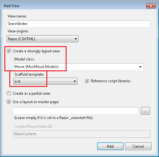 Now you can implement the SearchIndex view that will display the form to the user. Right-click inside the SearchIndex method and then click Add View. In the Add View dialog box, specify that you're going to pass a Movie object to the view template as its model class. In the Scaffold template list, choose List, then click Add.