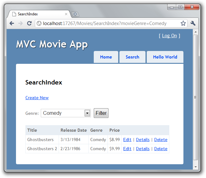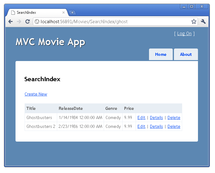 In this section, you'll examine the generated action methods and views for the movie controller. Then you'll add a custom search page.