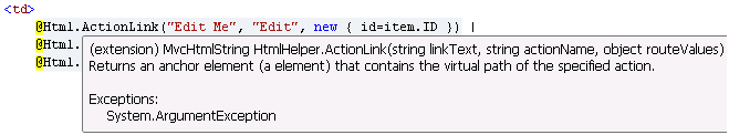 The Html object is a helper that's exposed using a property on the WebViewPage base class. The ActionLink method of the helper makes it easy to dynamically generate HTML hyperlinks that link to action methods on controllers. The first argument to the ActionLink method is the link text to render (for example, <a>Edit Me</a>). The second argument is the name of the action method to invoke. The final argument is an anonymous object that generates the route data (in this case, the ID of 4).