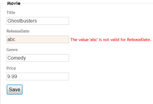 If the posted values aren't valid, they are redisplayed in the form. The Html.ValidationMessageFor helpers in the Edit.cshtml view template take care of displaying appropriate error messages.