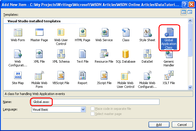 Lägg till filen i Global.asax webbprogrammets rotkatalog genom att högerklicka på namnet på webbplatsprojektet i Solution Explorer i Visual Studio och välja Lägg till nytt objekt. I dialogrutan Lägg till nytt objekt väljer du objekttypen Global programklass och klickar sedan på knappen Lägg till.