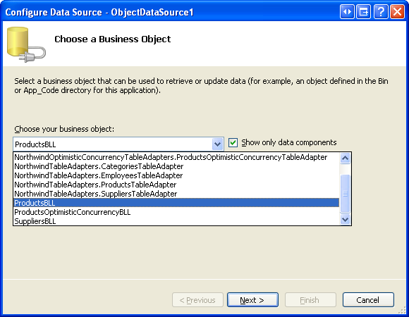 Konfigurera ObjectDataSource för att använda klassen ProductsBLL