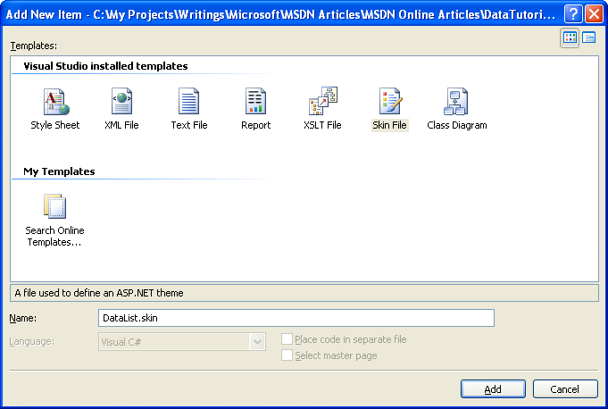 För att lägga till en skalfil, högerklicka på mappen App_Themes/DataWebControls , välj Lägg till ett nytt objekt och välj alternativet Skalfil från listan. Ge filen namnet DataList.skin.
