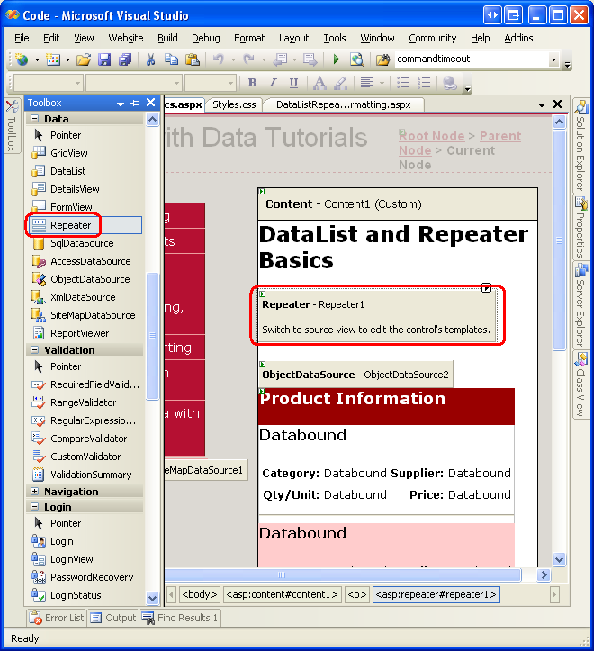 Till skillnad från DataList skapar Visual Studio inte automatiskt en ItemTemplate för Repeater när den har bundits till en datakälla. Dessutom kan Repeaters mallar inte konfigureras via Designer och måste anges deklarativt.