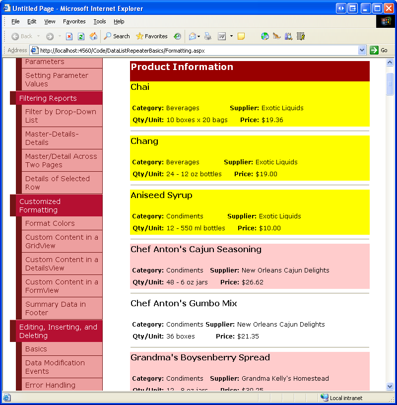 ItemDataBound När händelsehanteraren är klar går du tillbaka till Formatting.aspx sidan i en webbläsare. Som bild 2 visar har dessa produkter med ett pris under $20,00 både sitt namn och pris markerat.