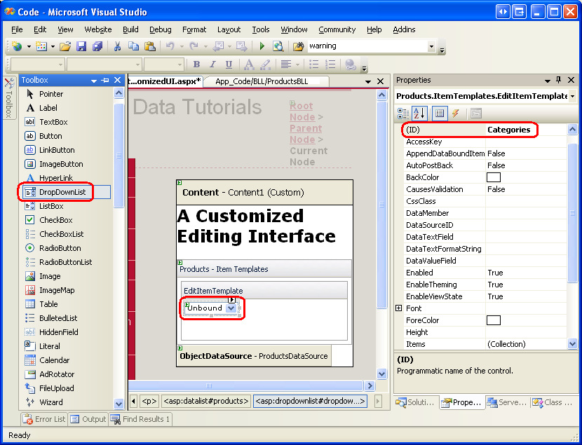 Om du vill anpassa redigeringsgränssnittet klickar du på länken Redigera mallar från den smarta taggen DataList och väljer EditItemTemplate alternativet i listrutan. Lägg till en listruta i EditItemTemplate och ange dess ID till Categories.