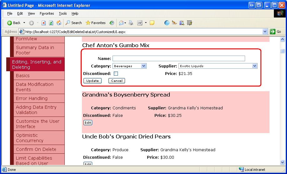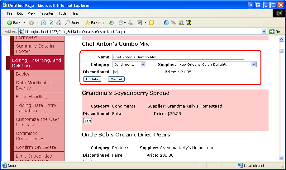 Tilldela ProductName datafältvärdet till ProductName TextBoxens Text egenskap, CategoryID och SupplierID datafältvärdena till Categories och Suppliers DropDownListsens SelectedValue egenskaper, och Discontinued datafältvärdet till Discontinued CheckBoxens Checked egenskap. När du har gjort dessa ändringar, antingen via designern eller direkt via deklarativ markering, går du tillbaka till sidan via en webbläsare och klickar på knappen Redigera för Chef Anton s Gumbo Mix. Som bild 9 visar har syntaxen för databindning lagt till de aktuella värdena i textrutan, listrutorna och kryssrutan.