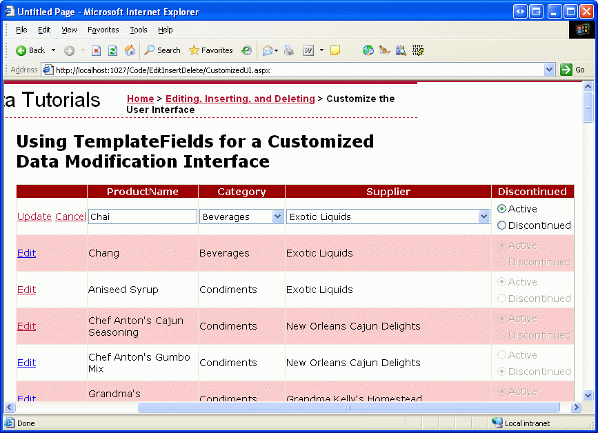 För närvarande uttrycks produkternas Discontinued datafält med hjälp av en CheckBoxField, som återger en inaktiverad kryssruta för de skrivskyddade raderna och en aktiverad kryssruta för raden som redigeras. Även om det här användargränssnittet ofta är lämpligt kan vi anpassa det om det behövs med hjälp av ett TemplateField. I den här självstudien ska vi ändra CheckBoxField till ett TemplateField som använder en RadioButtonList-kontroll med två alternativ "Active" och "Discontinued" från vilka användaren kan ange produktens Discontinued värde.