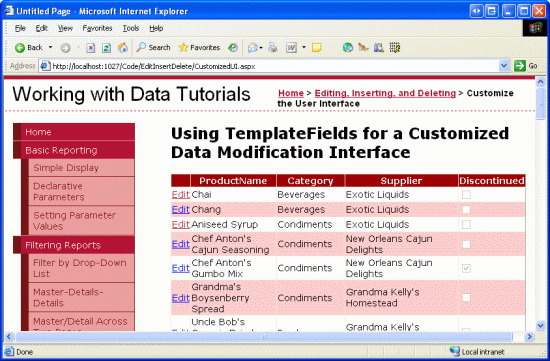 Kontrollerna BoundFields och CheckBoxFields som används av kontrollerna GridView och DetailsView förenklar processen för att ändra data på grund av deras möjlighet att återge skrivskyddade, redigerbara och infogbara gränssnitt. Dessa gränssnitt kan återges utan att du behöver lägga till ytterligare deklarativ kod. BoundField- och CheckBoxField-gränssnitten saknar dock den anpassningsbarhet som ofta behövs i verkliga scenarier. För att kunna anpassa det redigerbara eller infogbara gränssnittet i ett GridView- eller DetailsView-gränssnitt måste vi i stället använda ett TemplateField.