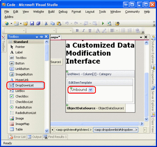 Eftersom BoundField har markerats som skrivskyddad innehåller både ItemTemplate och EditItemTemplate en etikettwebbkontroll vars Text egenskap är bunden till det tillämpliga datafältet (CategoryNamei syntaxen ovan). Vi måste ändra EditItemTemplate och ersätta Label-webbkontrollen med en DropDownList-kontroll.