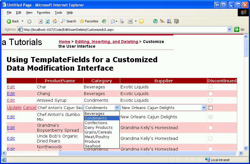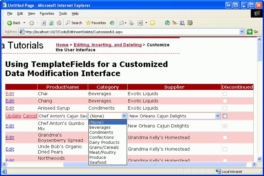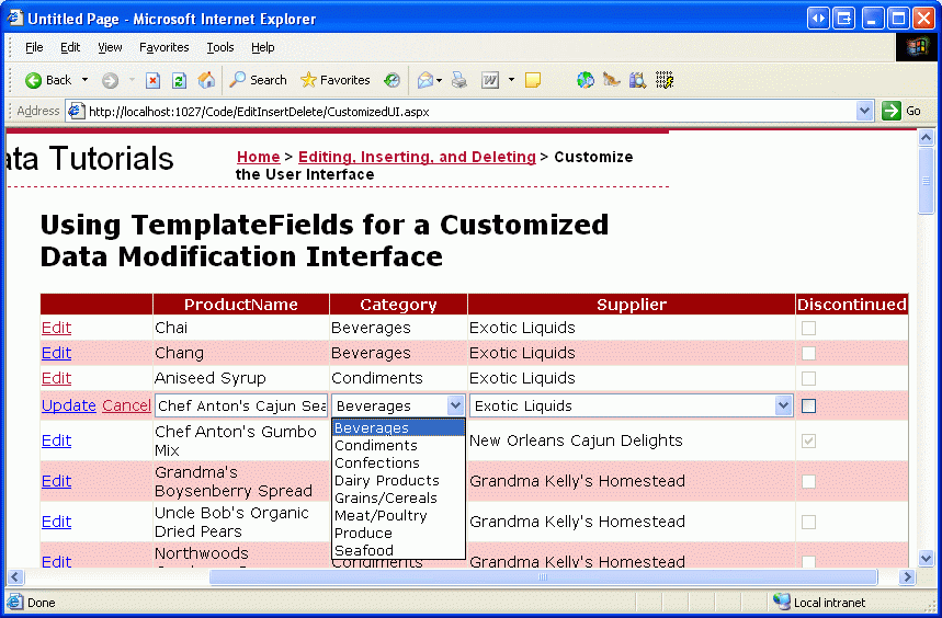 För att tillhandahålla det här beteendet behöver vi konvertera SupplierName och CategoryName BoundFields till TemplateFields, där ItemTemplate genererar SupplierName och CategoryName värdena och där EditItemTemplate använder en listrutekontroll för att lista tillgängliga kategorier och leverantörer.