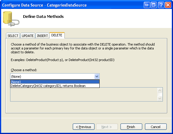 Eftersom den här ObjectDataSource bara används för att hämta data anger du listrutorna på flikarna UPPDATERA och TA BORT till (Ingen). Klicka på Slutför för att slutföra guiden.