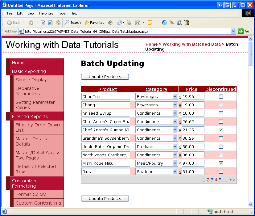 BatchUpdate.aspxFrån redigerar du sedan ett antal poster och ser till att ange ett av produktens UnitPrice värde till det förbjudna värdet ( 1234,56 ). Detta bör resultera i ett fel när du klickar på Uppdatera produkter, och att de andra ändringarna under batchåtgärden återställs till sina ursprungliga värden.