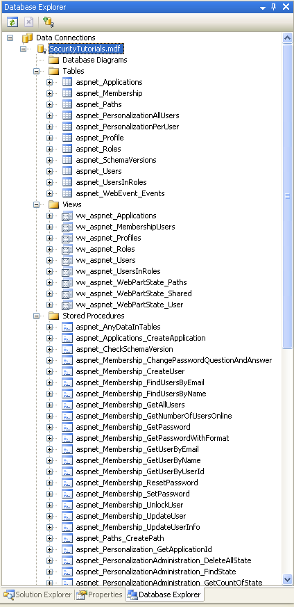 Nu har vi skapat de databasobjekt som behövs av SqlMembershipProvider. Vi måste dock fortfarande instruera medlemskapsramverket att det ska använda SqlMembershipProvider (jämfört med ActiveDirectoryMembershipProvider) och att SqlMembershipProvider ska använda SecurityTutorials-databasen. Vi ska titta på hur du anger vilken provider som ska användas och hur du anpassar den valda providerns inställningar i steg 4. Men först ska vi titta närmare på databasobjekten som just har skapats.
