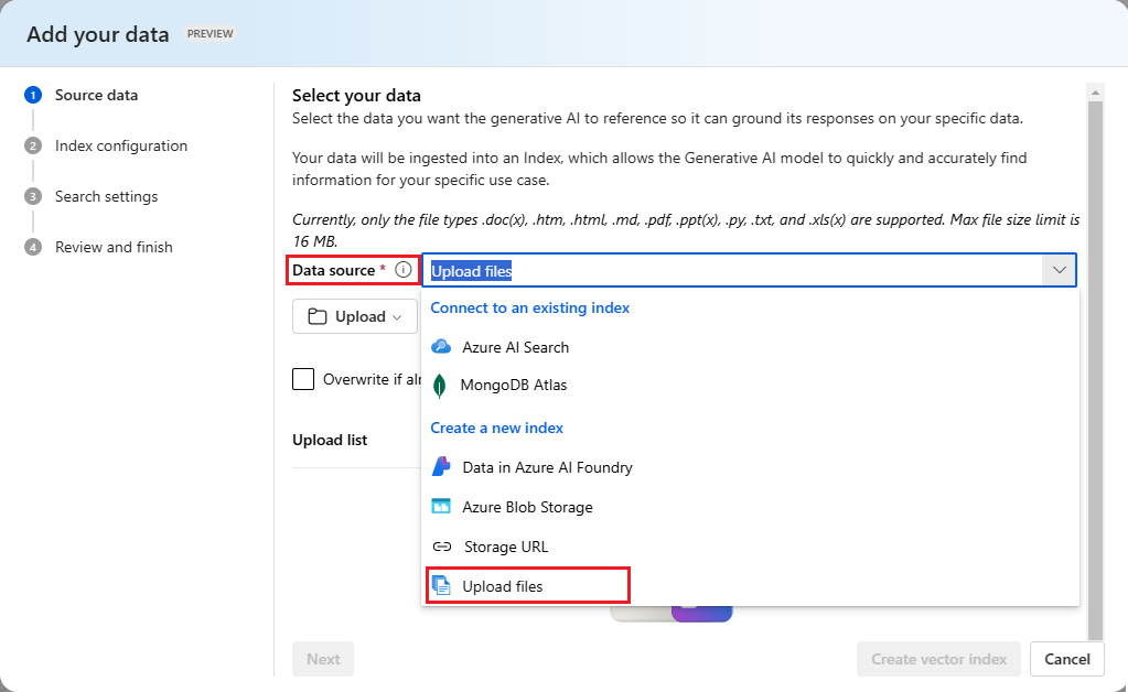 I listrutan Datakälla väljer du Ladda upp filer.