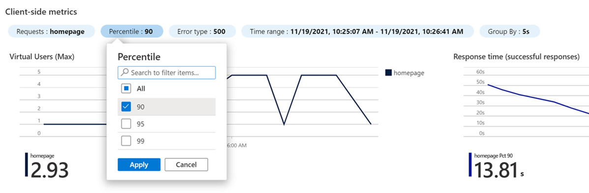 Du kan också ändra visningsfiltren för att visa ett visst tidsintervall, en resultatprocentil eller en feltyp.