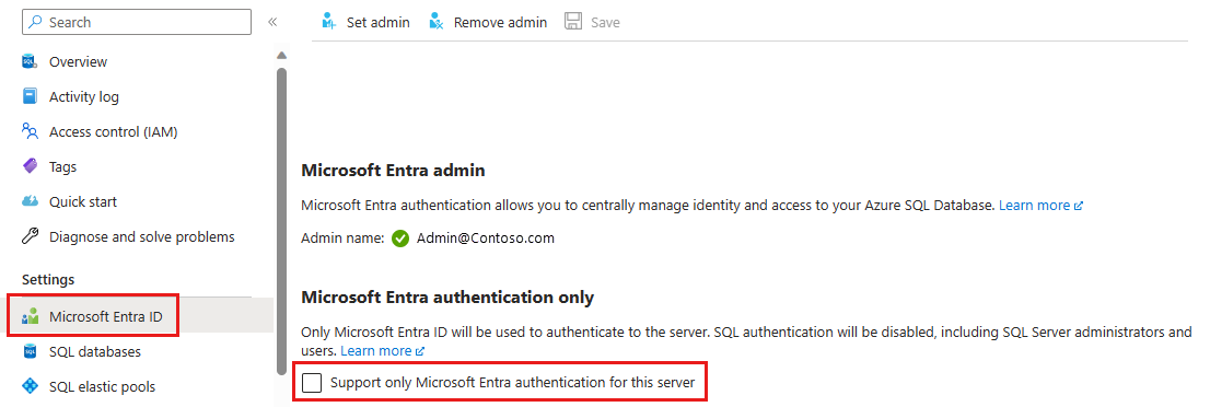 - Kontrollera om Endast Microsoft Entra-autentisering är aktiverat