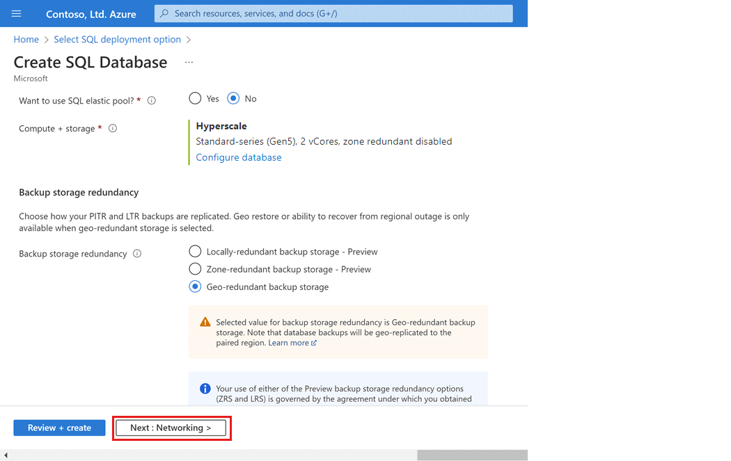 Tänk noga på konfigurationsalternativet för redundans för säkerhetskopiering av lagring när du skapar en Hyperskala-databas. Lagringsredundans kan bara anges när databasen skapas för Hyperskala-databaser. Du kan välja lokalt redundant, zonredundant eller geo-redundant lagring. Det valda alternativet för lagringsredundans används under databasens livslängd för både redundans för datalagring och redundans för lagring av säkerhetskopior. Befintliga databaser kan migrera till olika lagringsredundans med hjälp av databaskopiering eller återställning till tidpunkt.