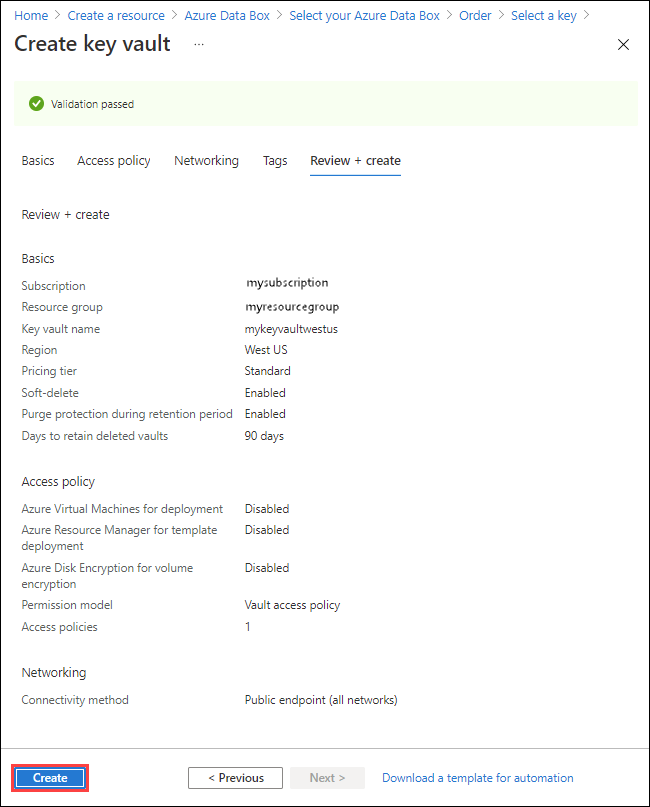 - Eller välj Skapa nytt nyckelvalv om du vill skapa ett nytt nyckelvalv. - På skärmen Skapa nyckelvalv anger du sedan resursgruppen och ett nyckelvalvnamn. Kontrollera att mjuk borttagning och rensningsskydd är aktiverade. Acceptera alla övriga standardvärden och välj Granska och skapa. - Granska informationen för ditt nyckelvalv och välj Skapa. Vänta några minuter tills skapandet av nyckelvalvet har slutförts.