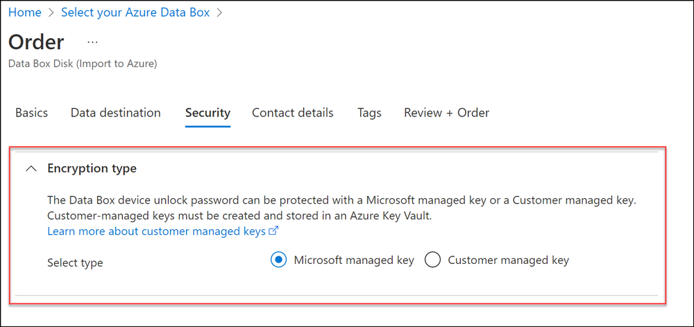 - Om du vill använda din egen kundhanterade nyckel för att skydda nyckellåset för din nya resurs expanderar du Krypteringstyp. - Det är valfritt att konfigurera en kundhanterad nyckel för Din Azure Data Box Disk. Som standard använder Data Box en Microsoft-hanterad nyckel för att skydda upplåsningsnyckeln. - En kundhanterad nyckel påverkar inte hur data på enheten krypteras. Nyckeln används endast för att kryptera enhetens upplåsningsnyckel. - Om du inte vill använda en kundhanterad nyckel går du vidare till steg 14.