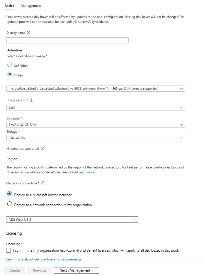 2. Välj önskad distributionsregion för utvecklingsrutorna. Välj en region nära dina förväntade dev box-användare för optimal användarupplevelse.Licensiering Markera den här kryssrutan för att bekräfta att din organisation har Azure Hybrid-förmånslicenser som du vill använda för utvecklingsmiljöerna i den här poolen. På fliken Hantering anger du följande värden: