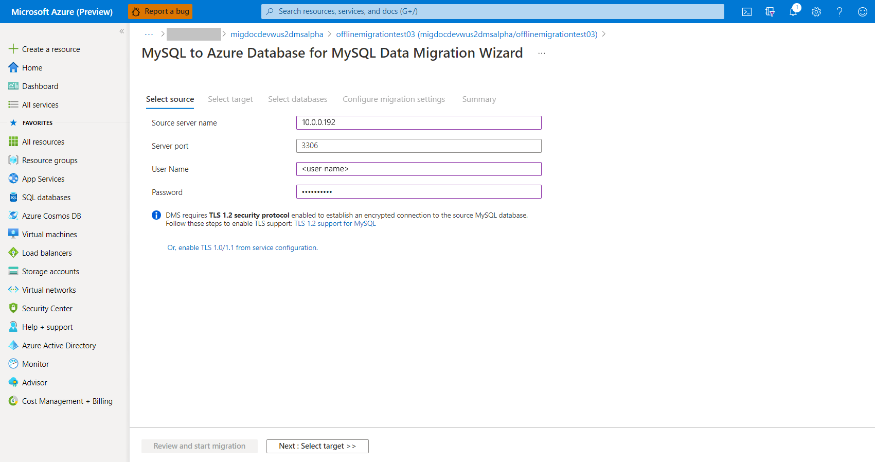 På skärmen Välj källa anger du anslutningsinformationen för MySQL-källinstansen och väljer Nästa: Välj mål >>