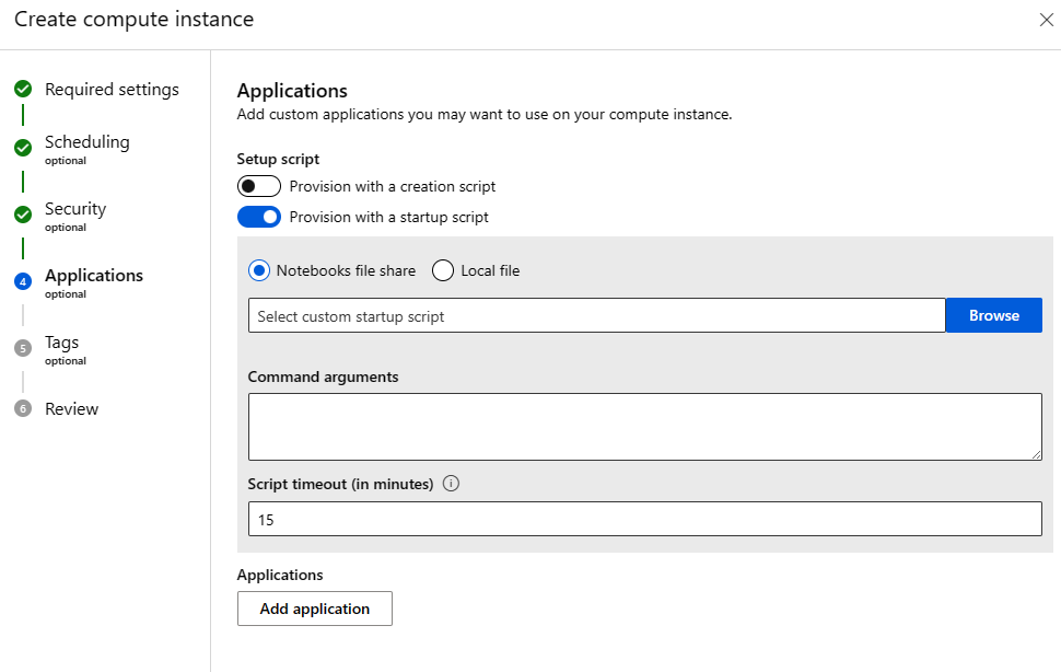 - På sidan Program i formuläret växlar du på vilken typ av skript du vill använda, skapar skript (körs en gång när du skapar beräkningsinstansen) eller startskriptet (körs varje gång beräkningsinstansen startas).