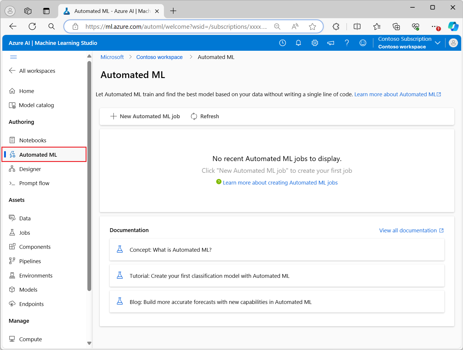 I den här artikeln konfigurerar du automatiserade maskininlärningsträningsjobb med hjälp av Azure Machine Learning Automated ML i Azure Machine Learning-studio. Med den här metoden kan du konfigurera jobbet utan att skriva kod. Automatiserad ML är en process där Azure Machine Learning väljer den bästa maskininlärningsalgoritmen för dina specifika data. Med processen kan du snabbt generera maskininlärningsmodeller. Mer information finns i Översikt över den automatiserade ML-processen.