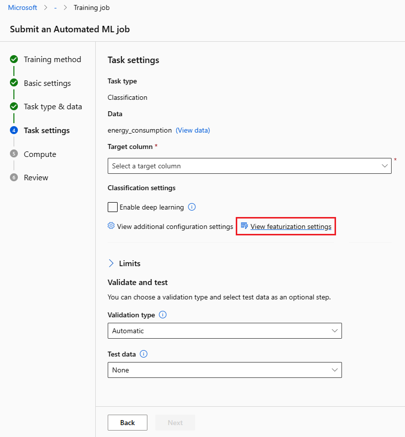 På sidan Featurization visas standardtekniker för funktionalisering för dina datakolumner. Du kan aktivera/inaktivera automatisk funktionalisering och anpassa inställningarna för automatisk funktionalisering för experimentet.