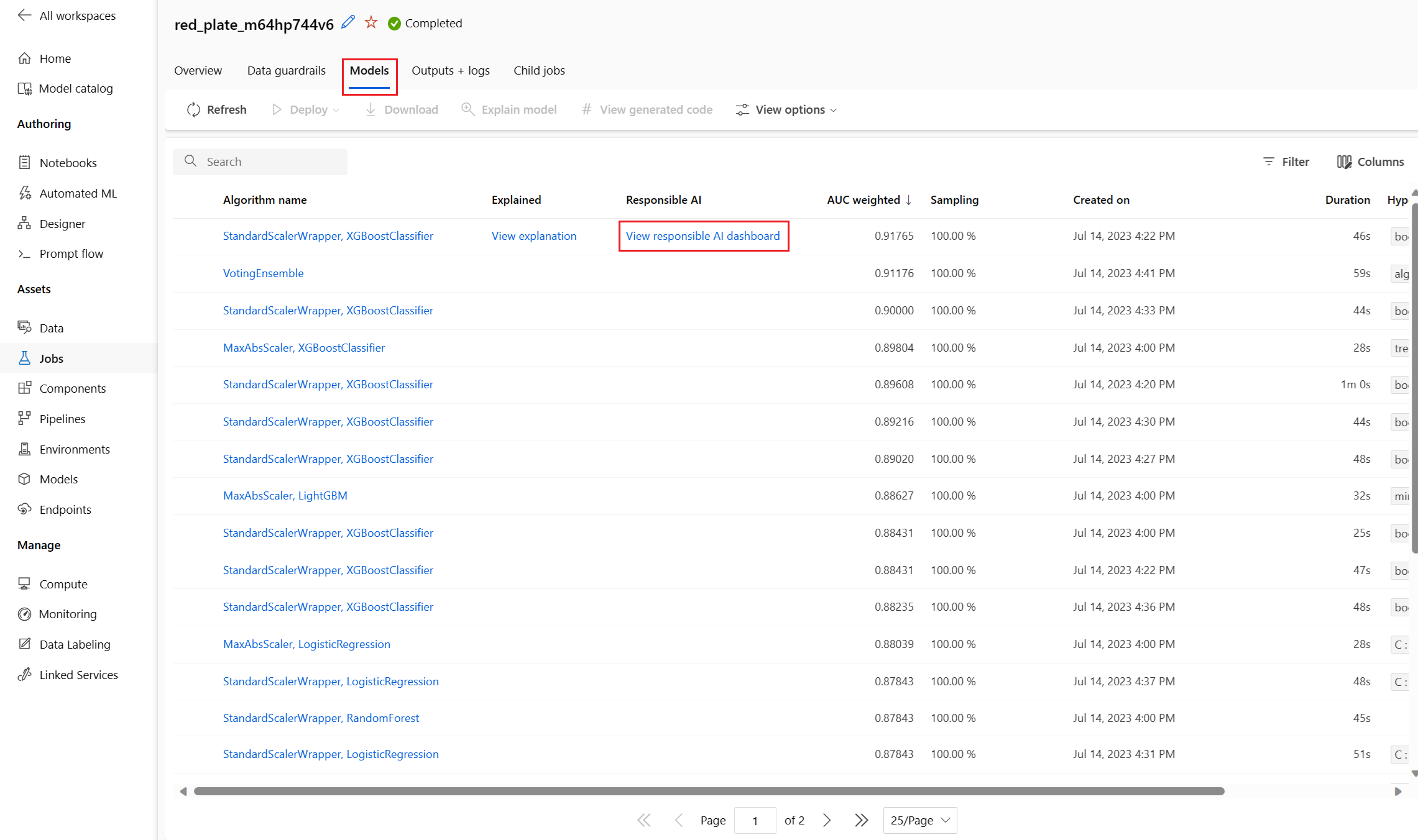 Fliken Modeller innehåller en lista över de modeller som skapats ordnade efter måttpoängen. Som standard visas modellen med högst poäng utifrån det valda måttet överst i listan. När träningsjobbet provar fler modeller läggs de tränade modellerna till i listan. Använd den här metoden för att få en snabb jämförelse av måtten för de modeller som skapas.