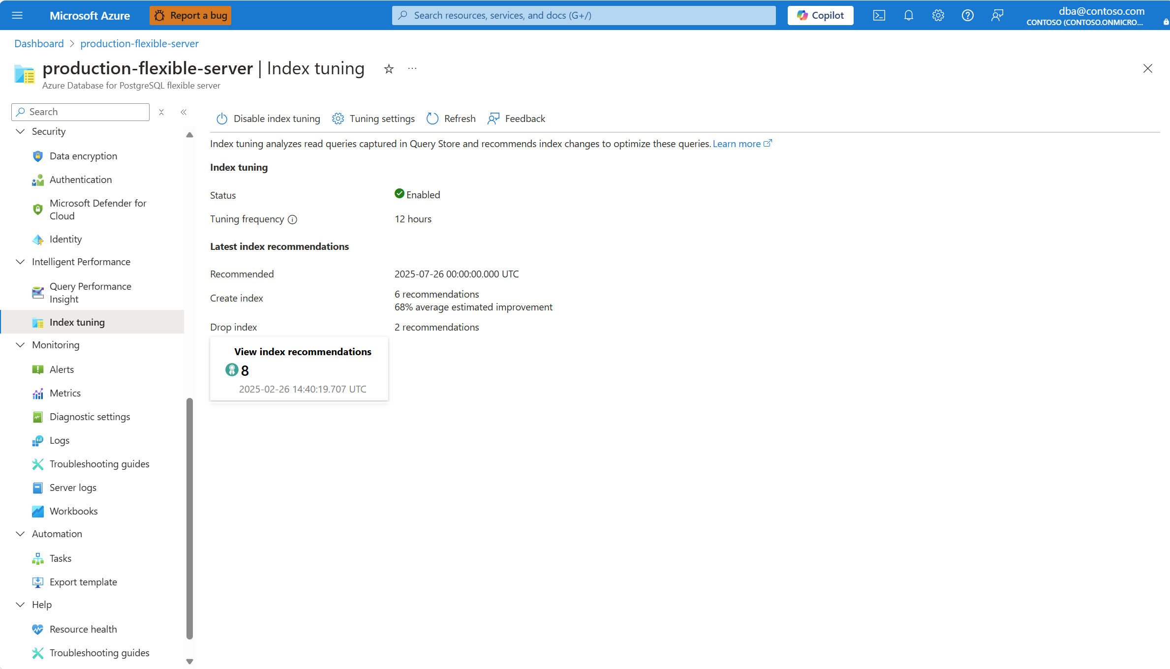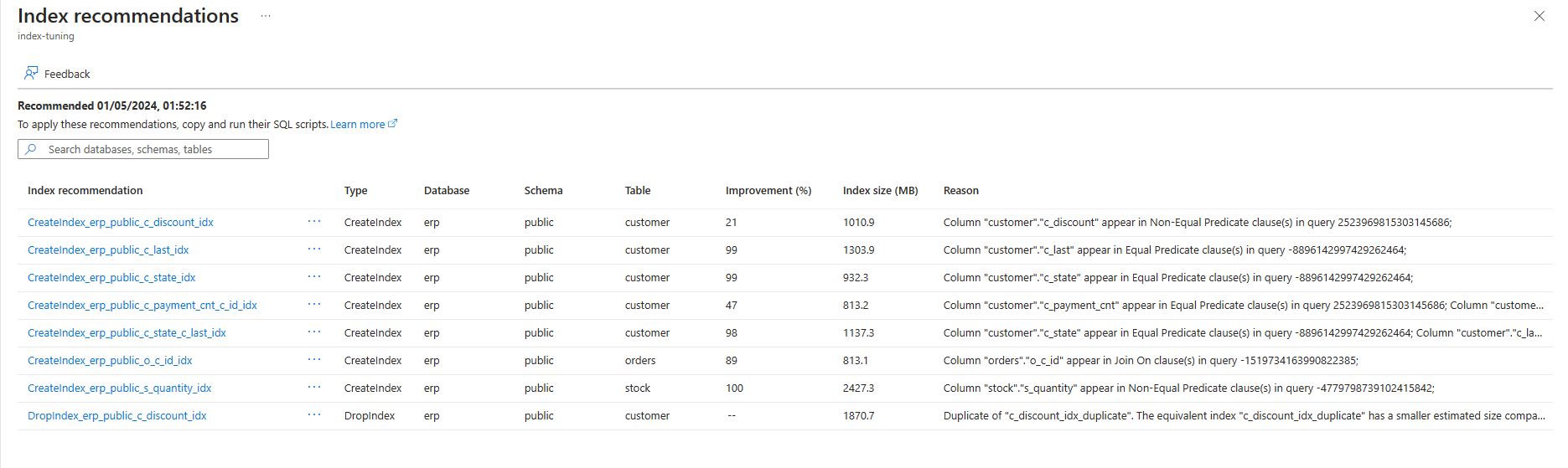 Du kan lista rekommendationer för indexjustering som skapas genom indexjustering på en befintlig server via kommandot az postgres flexible-server index-tuning list-recommendations .