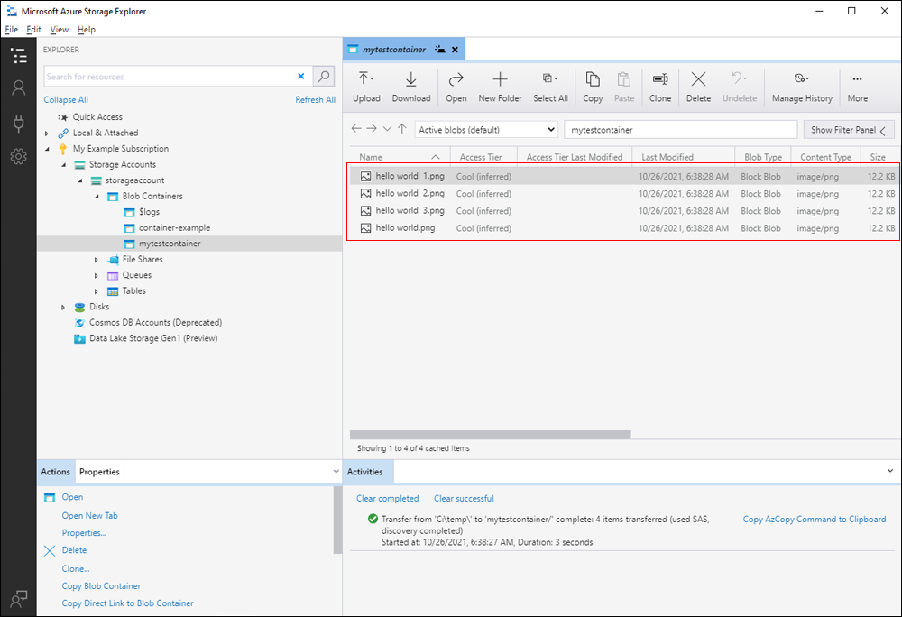 I den här snabbstarten får du lära dig hur du skapar en container och en blob med Azure Storage Explore. Du får lära dig hur du hämtar bloben till din lokala dator och hur du visar alla blobar i en container. Du får också lära dig hur du skapar en ögonblicksbild av en blob, hanterar åtkomstprinciper för containrar och skapar en signatur för delad åtkomst.