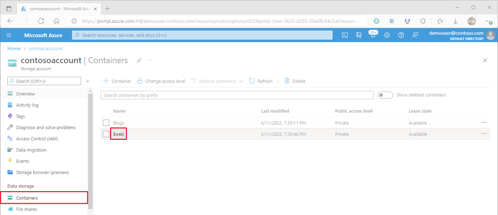 Bild som visar var du hittar lagringscontainern för webbplatsen i Azure-portalen