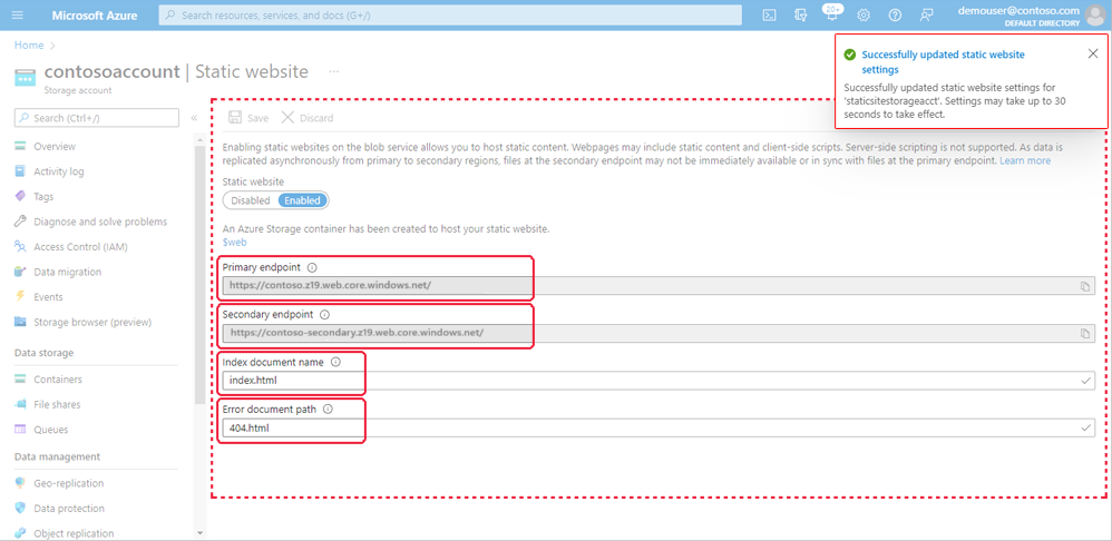 8. Ett bekräftelsemeddelande visas. Slutpunkterna för den statiska webbplatsen och annan konfigurationsinformation visas i fönstret Översikt .