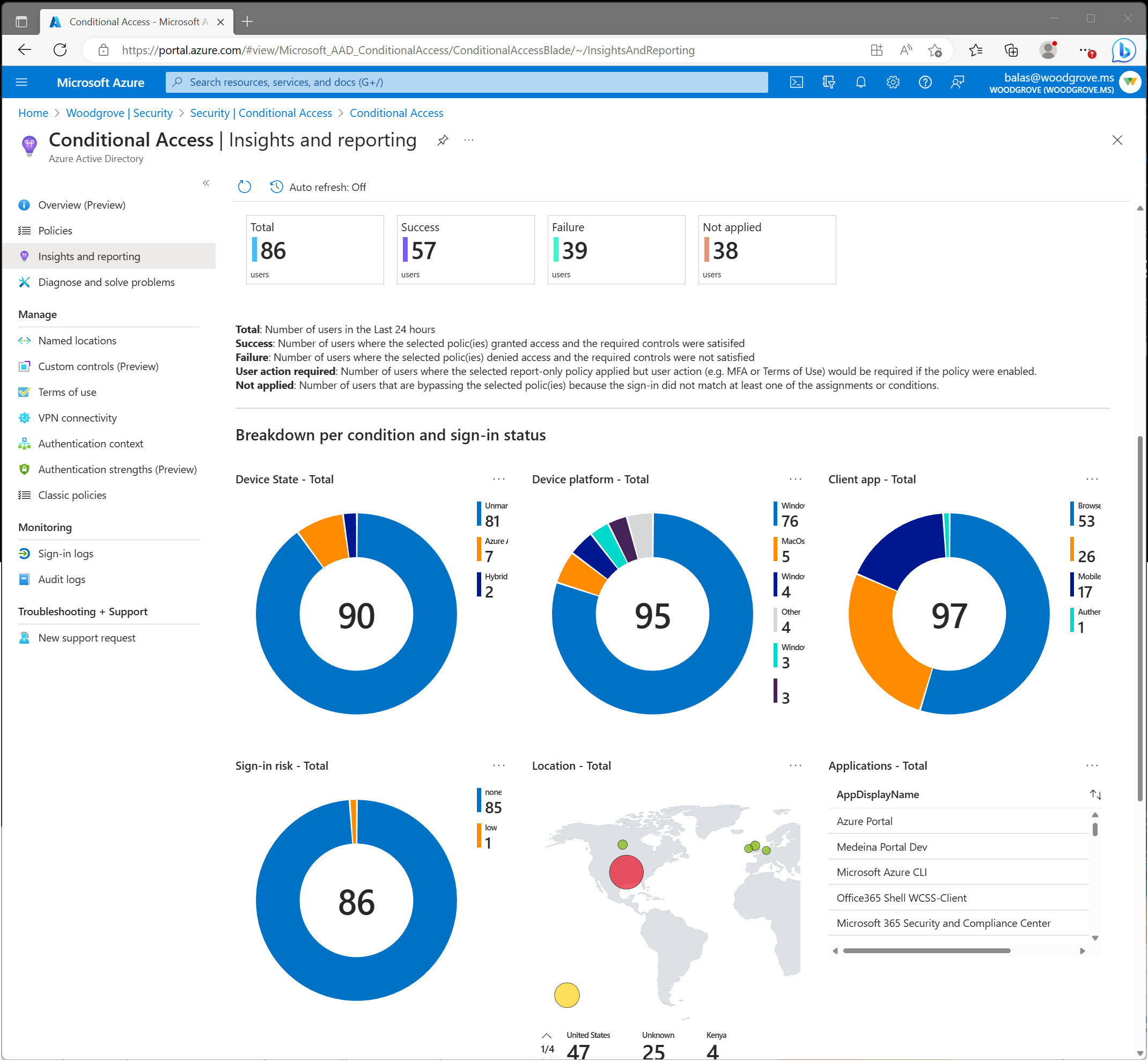 - Bläddra till Entra ID>Villkorsstyrd åtkomst>Insikter och rapportering.