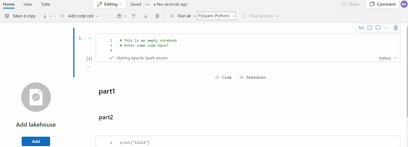 En Microsoft Fabric-notebook-fil är ett primärt kodobjekt för att utveckla Apache Spark-jobb och maskininlärningsexperiment. Det är en webbaserad interaktiv yta som används av dataforskare och datatekniker för att skriva kod som drar nytta av omfattande visualiseringar och Markdown-text. Den här artikeln beskriver hur du skapar anteckningsblock med kodcellsåtgärder och kör dem.