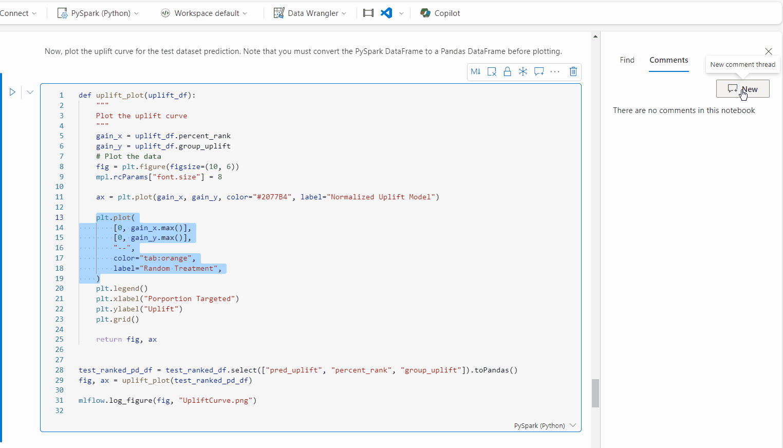 Välj ett kodavsnitt i en cell och ny kommentarstråd.