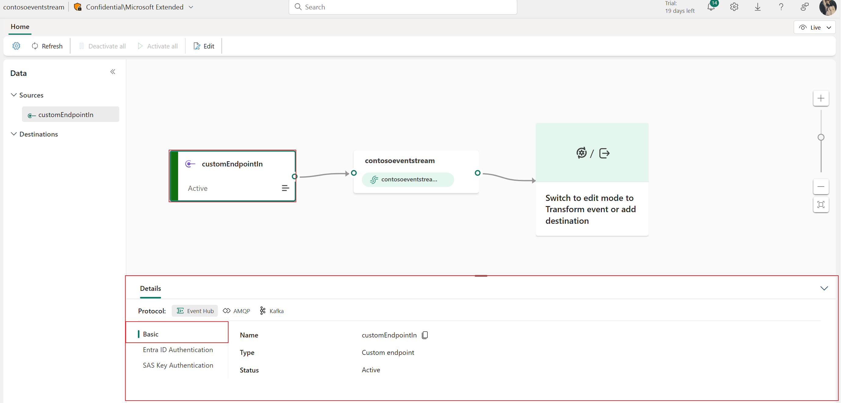 Om du vill lägga till en anpassad slutpunktskälla går du till sidan Komma igång och väljer Använd anpassad slutpunkt. Om du redan har en publicerad händelseström och vill lägga till anpassade slutpunktsdata som källa växlar du till redigeringsläge. I menyfliksområdet väljer du Lägg till anpassad källslutpunkt>.