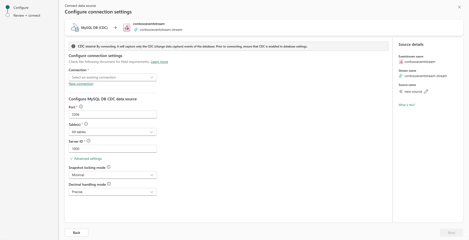 Ange följande information för att konfigurera MySQL DB CDC-datakällan och välj sedan Nästa.