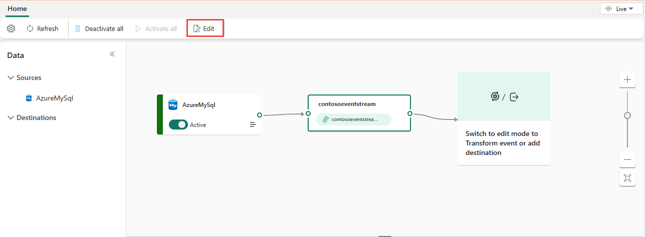 Du ser källan MySQL DB (CDC) som lagts till i din händelseström i Redigeringsläge.