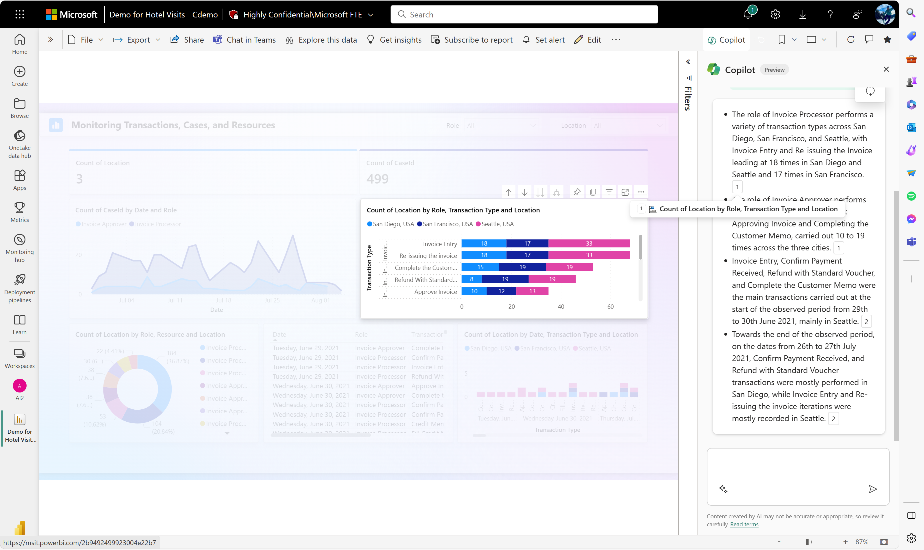 I den här fristående Copilot upplevelsen kan du be om att sammanfatta data, ställa frågor, generera insikter eller skapa chefsöversikter baserat på dina Power BI-rapporter. Du kan också ställa uppföljningsfrågor, använda anpassade frågor, fortsätta konversationen och hoppa direkt till rapporten för djupare analys när det behövs.