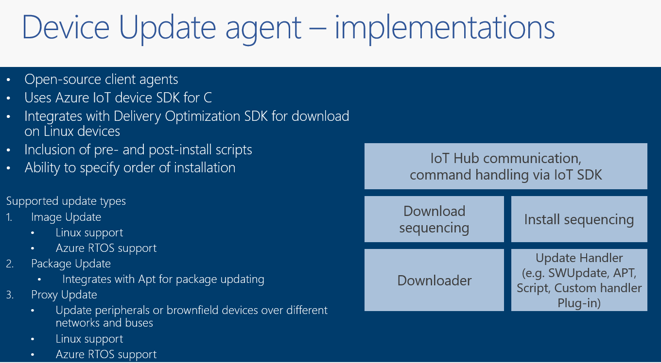 Uppdateringshanterare används för att anropa installationsprogram eller kommandon för att göra en over-the-air-uppdatering. Du kan antingen använda befintliga uppdateringsinnehållshanterare eller implementera en anpassad innehållshanterare som kan anropa alla installationsprogram och köra den over-the-air-uppdatering som behövs för ditt användningsfall.